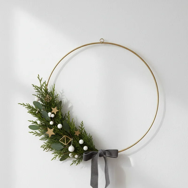 Embrace the less-is-more philosophy with a modern hoop wreath that makes a sophisticated statement through simplicity and negative space. Use a large metal or wooden embroidery hoop as your base, leaving much of it exposed for that contemporary aesthetic. Attach a small cluster of greenery, white flowers, or metallic elements to just one section, creating an asymmetrical design that draws the eye. The minimalist approach lets each element shine without competing for attention, perfect for modern homes with clean lines. Choose monochromatic color schemes like all white, silver, or sage green for cohesive elegance that whispers rather than shouts. This style particularly suits smaller spaces where a traditional full wreath might overwhelm the entrance. Add a simple geometric ornament or single statement bow for a touch of festivity without cluttering the design. The result feels fresh, intentional, and refreshingly different from typical holiday excess.