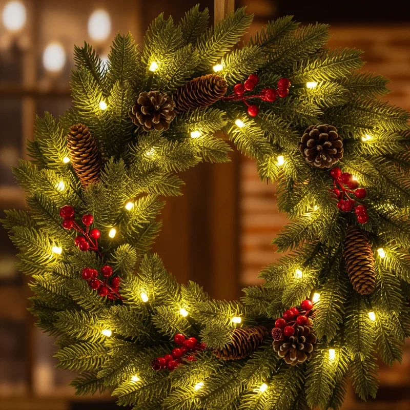 Transform your wreath into a beacon of holiday cheer with integrated LED lights that make your door glow day and night. Weave battery-operated LED strings throughout your chosen wreath base, whether traditional evergreen or modern alternatives. Choose from warm white for classic elegance, multicolor for playful charm, or programmable RGB for customizable light shows. The illumination creates dramatic curb appeal that welcomes guests and spreads joy to passing neighbors after dark. Timer functions ensure your wreath lights automatically, saving battery life while maintaining consistent evening display schedules. Waterproof battery packs hidden within the wreath protect electronics from winter weather while maintaining clean aesthetics. The added light layer transforms even simple wreaths into magical displays that photograph beautifully for holiday memories. This upgrade works with any wreath style, adding wow factor without complete redesign investment.