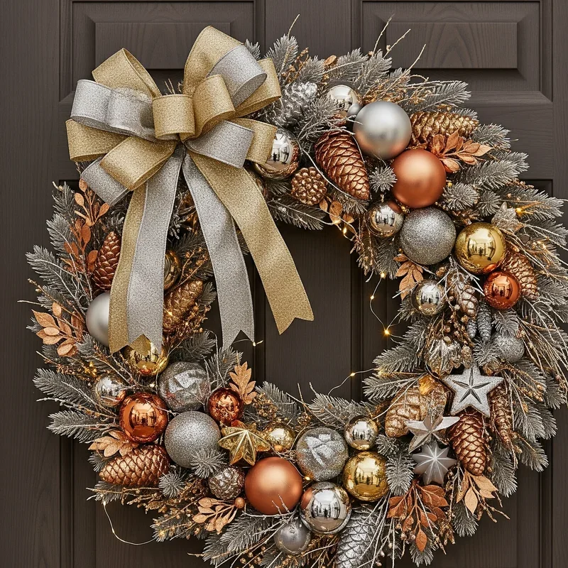 Go bold with a glamorous metallic wreath that brings New Year's Eve sparkle to your Christmas door decor. Spray paint natural elements like pine cones, branches, and leaves in gold, silver, copper, or rose gold. Layer different metallic shades for depth and interest that catches and reflects light from every angle dynamically. Add metallic ornaments, beads, and ribbons to amplify the luxe effect without restraint or apology. The dramatic design makes a confident statement perfect for those who believe more is more during holidays. Include mirror or disco ball ornaments for extra reflection and sparkle that dazzles during sunny winter days. Battery-operated copper wire lights woven throughout add warm glow that complements metallic finishes beautifully after dark. This show-stopping design proves that holiday decor can be both festive and fashion-forward simultaneously.