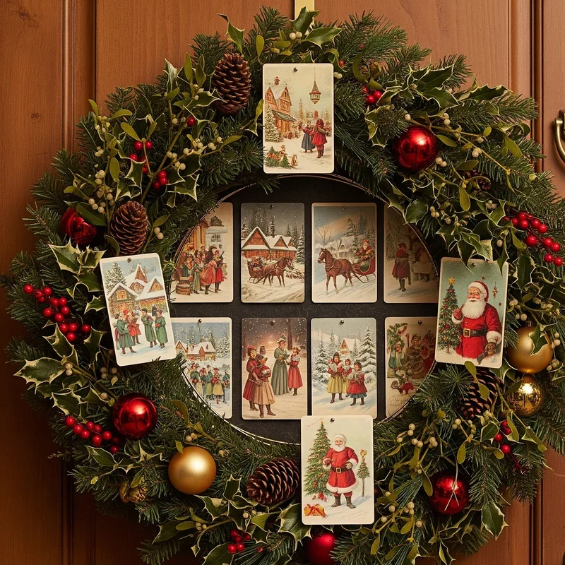 Transform cherished Christmas cards into a sentimental wreath that tells your family's holiday story through generations of greetings. Create pockets using clear page protectors or vintage-style envelopes attached to a wire wreath frame in overlapping layers. Display vintage cards collected from antique stores or family collections, rotating them throughout the season for variety. The nostalgic design sparks conversations and memories while adding personal meaning beyond typical store-bought decorations. Include miniature clothespins or decorative clips that allow easy card swapping as new ones arrive during the season. Add battery-operated string lights behind translucent cards for a magical glow that highlights vintage illustrations beautifully. Small vintage ornaments or bells tucked between cards add dimension and gentle sound when the door opens. This eco-friendly option gives new life to cards that might otherwise be stored away forgotten.