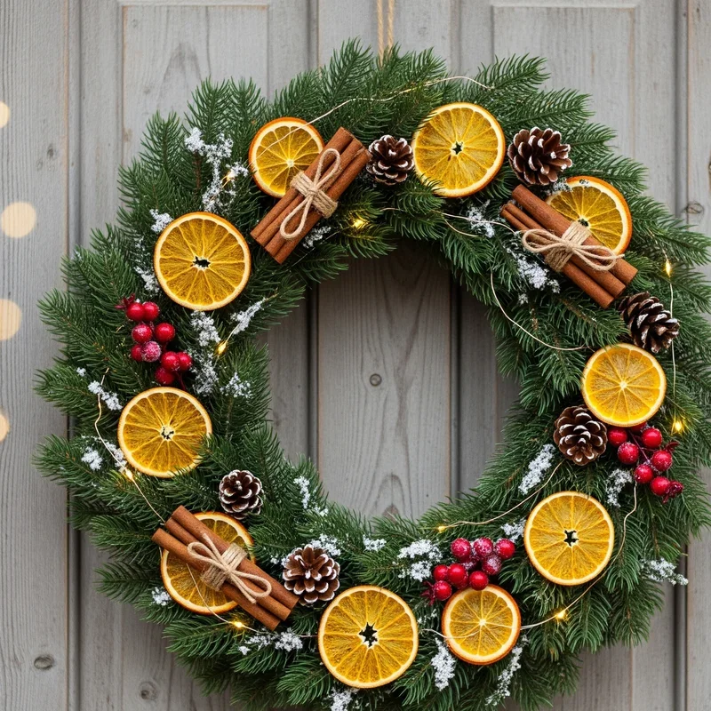 Fill your entryway with the warm scents of the season using a natural wreath made from dried citrus and spices. Dehydrate orange, lemon, and lime slices in your oven, then wire them to a simple branch or vine base. Add whole cinnamon sticks, star anise, and dried apple slices for additional fragrance and visual texture variety. The natural materials create an organic, homespun feeling that appeals to those seeking sustainable, biodegradable holiday decor. The warm color palette of oranges and browns provides a cozy alternative to traditional Christmas red and green. Bundle cinnamon sticks with twine or ribbon for structured elements among the circular fruit slices' flowing arrangement. This aromatic wreath releases subtle fragrance when warmed by sunlight, greeting visitors with holiday scents naturally. The completely compostable design aligns with eco-friendly values while delivering authentic, handcrafted charm.