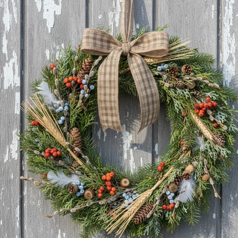 Channel Scandinavian simplicity with a natural wreath that celebrates winter's quiet beauty through organic materials and muted tones. Use a base of silver birch branches or white-washed grapevine for that characteristic Nordic pale wood aesthetic. Add preserved eucalyptus, white berries, and dried cotton flowers for subtle texture without overwhelming color or pattern. Small wooden ornaments like stars, hearts, or miniature ski-inspired decorations maintain the hygge feeling perfectly. The understated elegance works beautifully with modern minimalist homes or anyone seeking peaceful holiday decor. Include natural elements like small bird figurines or tiny wooden houses for storytelling charm without kitsch. A simple linen or cotton bow in natural or white completes the look without adding unnecessary fuss. This style proves that holiday decorating can feel festive while maintaining the calm, cozy atmosphere Scandinavian design is famous for.
