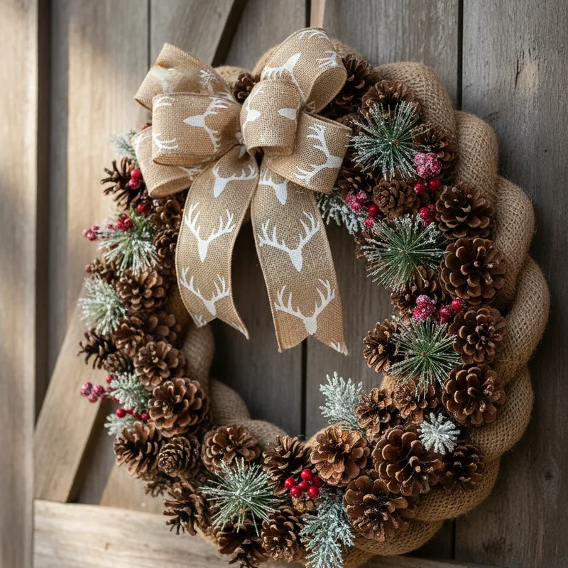 Channel cozy cabin vibes with a rustic wreath that combines natural textures and earthy tones for warmth without overwhelming color. Wrap a foam wreath form with burlap ribbon, leaving some edges frayed for that perfectly imperfect farmhouse aesthetic. Hot-glue pine cones of varying sizes around the wreath, mixing in dried lotus pods and cotton bolls for unexpected texture. Add sprigs of dried wheat or pampas grass for movement and softness that catches winter breezes beautifully. The neutral palette works wonderfully with homes featuring natural wood doors or stone exteriors. Dust pine cones with artificial snow or white paint tips for a frost-kissed effect that bridges fall and winter. Include small battery-operated fairy lights woven throughout for evening magic without overwhelming the natural elements. This budget-friendly option uses mostly foraged or inexpensive materials while delivering maximum style impact.