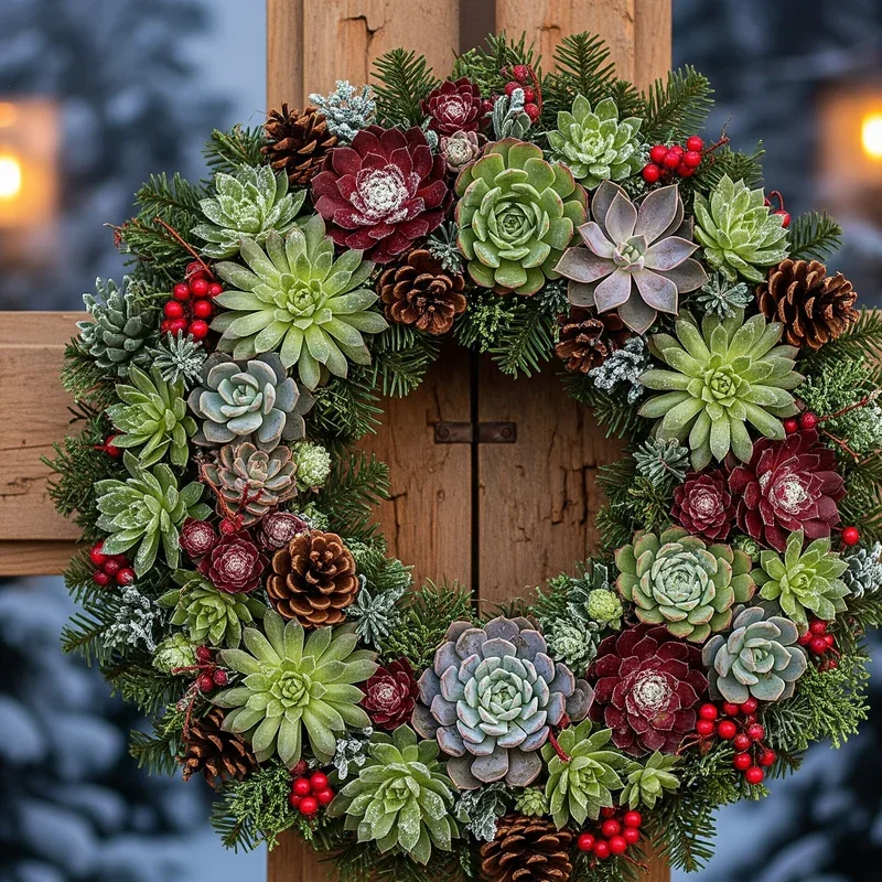 Combine trending succulents with holiday styling for a fresh take that lasts long after traditional wreaths fade. Create a living wreath using a moss-filled frame planted with various succulents in Christmas colors like red, silver, and green. The unexpected combination of desert plants and holiday decor creates conversation-starting contrast that feels modern and unique. Add small ornaments, miniature lights, or festive picks among the succulents for seasonal flair without overwhelming natural beauty. The living wreath continues growing and changing throughout the season, providing ongoing interest and engagement. Mist occasionally to keep succulents happy, though their low-water needs make maintenance easier than traditional fresh wreaths. After the holidays, remove decorations and enjoy your succulent wreath year-round as living art. This sustainable option appeals to plant lovers and eco-conscious decorators seeking alternatives to disposable decorations.