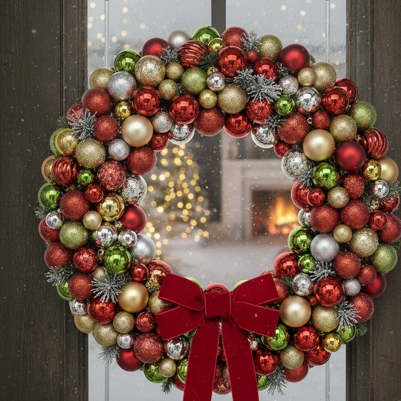 Skip the greenery entirely and create a dazzling display using nothing but Christmas ornaments for maximum visual impact and shine. Start with a wire wreath form and attach ornaments using floral wire, layering sizes from large statement pieces to tiny fillers. Mix finishes like matte, glitter, metallic, and mercury glass for depth and interest that changes with viewing angle. Choose a cohesive color scheme or go bold with rainbow hues for a more playful, maximalist approach to holiday decorating. The dense clustering creates a luxurious, abundant feeling that screams celebration and festivity from the curb. Shatterproof ornaments ensure your creation survives winter winds and curious wildlife without heartbreak or cleanup. This design allows you to match your wreath perfectly to your tree's color scheme for coordinated holiday style. The reflective surfaces create beautiful light play during both day and evening hours.