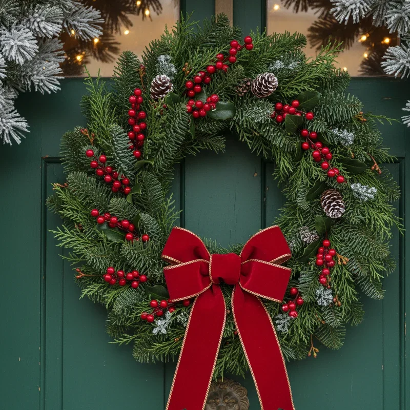 Nothing beats the timeless appeal of a traditional evergreen wreath that fills your entryway with that quintessential Christmas tree scent. Start with a mix of pine, fir, and cedar branches for varied textures and shades of green that create visual depth. Add clusters of red berries, pine cones, and a luxurious velvet bow for that classic Christmas look everyone recognizes and loves. The beauty lies in its simplicity: this design works with any home style, from colonial to contemporary. Fresh evergreens last 3-4 weeks outdoors with occasional misting, making them perfect for the entire holiday season. Choose a wire frame that's proportional to your door, typically 24-30 inches for standard entries. The natural materials age gracefully, developing a lovely patina as the season progresses. This wreath style never goes out of fashion because it captures the essence of Christmas itself.
