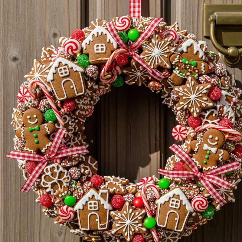 Create a wreath that looks good enough to eat with gingerbread-inspired decorations that bring bakery charm to your door. Attach faux gingerbread cookies, candy decorations, and miniature gingerbread houses to a brown grapevine or cinnamon stick base. Use white ribbon or paint to create "icing" details that tie elements together visually like decorated cookies. Add real cinnamon sticks and dried orange slices for authentic gingerbread scent that enhances the edible illusion. The whimsical design delights visitors of all ages while evoking memories of holiday baking traditions and family time. Include felt or fabric gingerbread men for weather-resistant alternatives that maintain the theme through winter storms. Small battery-operated lights create a warm glow reminiscent of ovens full of baking cookies inside. This playful approach brings storybook charm that makes everyone smile while passing your festively decorated entrance.