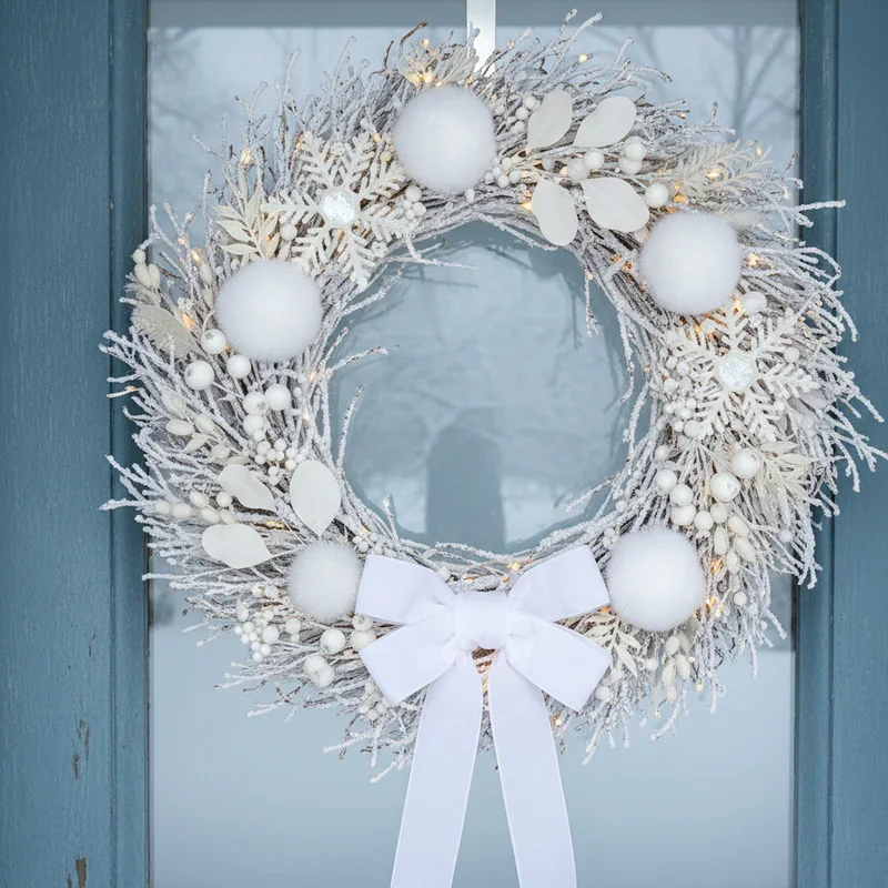 Transform your entrance into a winter palace with an all-white wreath that exudes sophistication and serene beauty. Layer white-painted branches, bleached pine cones, and cream-colored flowers for a monochromatic masterpiece that feels both festive and refined. Incorporate different textures like white feathers, pearl beads, and silk roses to create visual interest within the limited color palette. The neutral design complements any door color while standing out beautifully against dark wood or bold painted doors. Add silver or champagne accents sparingly for subtle sparkle that catches light without breaking the ethereal effect. White battery-operated LED lights woven throughout create a soft glow reminiscent of fresh snowfall under moonlight. This elegant approach proves that Christmas decor doesn't require red and green to feel festive and special. The sophisticated result photographs beautifully for holiday cards and social media posts.
