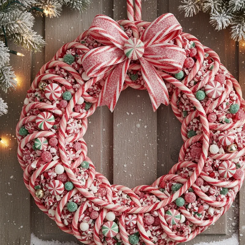 Create a whimsical wonderland that brings out everyone's inner child with a candy-themed wreath bursting with peppermint charm. Arrange real or faux candy canes in alternating patterns around your wreath base, creating that iconic red and white stripe effect. Hot-glue wrapped peppermint candies, gumdrops, and lollipops between the candy canes for a sweet shop window effect. Add white tulle or ribbon bows that mimic spun sugar and cotton candy for extra confectionery magic. The playful design delights children and makes adults smile with nostalgic memories of childhood Christmases past. Weather-resistant replicas ensure your sweet creation survives winter elements without melting into a sticky mess. Include battery-operated lights that make the "candies" glow like they're fresh from Santa's workshop. This cheerful design works especially well for families with young children or anyone who loves kitsch holiday decor.
