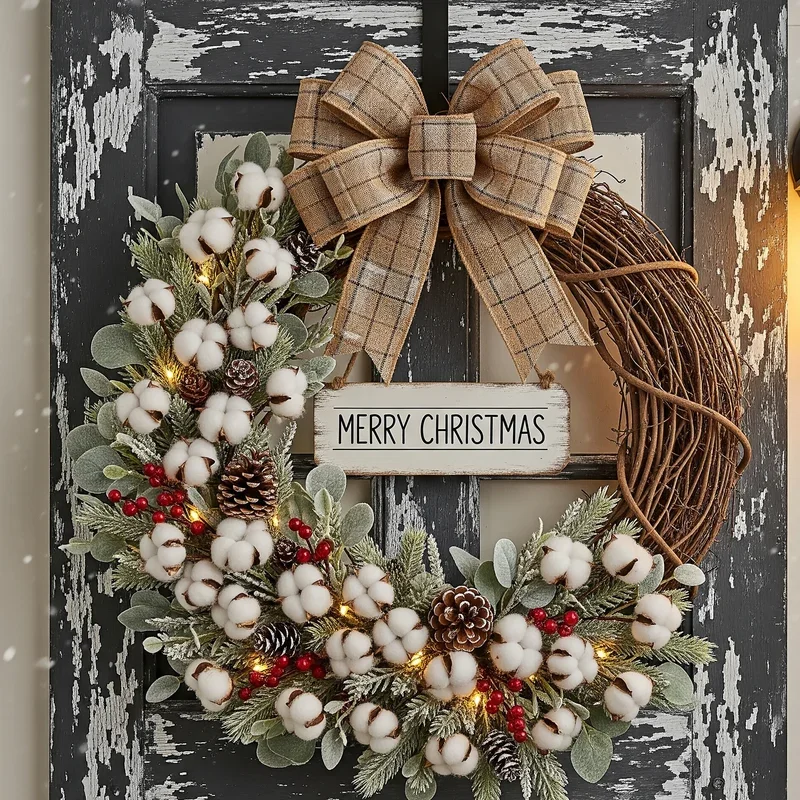 Embrace southern charm with a cotton stem wreath that brings farmhouse elegance and unexpected texture to holiday decorating. Arrange dried cotton bolls on branches around a grapevine base, creating fluffy white clusters reminiscent of snow. Mix in preserved magnolia leaves, pine cones, and red berries for traditional Christmas colors with southern twist. The combination creates stunning contrast between soft cotton and glossy magnolia that catches light beautifully. Add a buffalo plaid or ticking stripe bow for authentic farmhouse style that Joanna Gaines would approve. The neutral cotton works with any home color scheme while adding cozy, nostalgic feelings to your entrance. Small battery lights nestled among cotton bolls create gentle glow without overwhelming the natural materials' beauty. This unique approach stands out among typical evergreen wreaths while maintaining festive holiday spirit perfectly.
