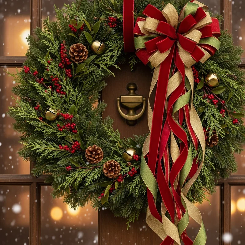 Create movement and drama with cascading ribbons that transform a simple wreath into a stunning statement piece. Start with a basic evergreen or grapevine wreath, then attach various ribbons in complementary patterns and widths. Let ribbons flow naturally, cutting them at different lengths for an organic waterfall effect that moves with winter breezes. Mix textures like velvet, satin, burlap, and plaid for visual interest that prevents monotony despite the ribbon-focused design. The flowing design adds vertical interest that elongates your entrance and draws eyes upward architecturally. Choose weather-resistant ribbons that won't fade or fray with moisture exposure during the holiday season. Add small ornaments or bells to ribbon ends for weight and subtle sound that announces visitors' arrivals. This versatile design adapts to any color scheme while maintaining dramatic impact and festive flair.