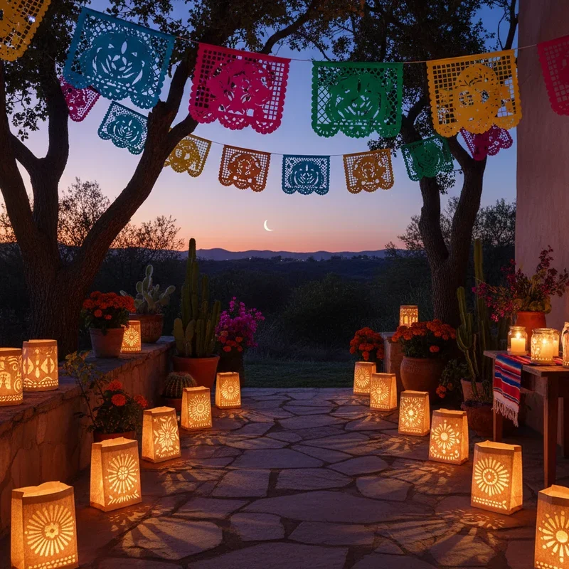 Transform your outdoor space into a magical wonderland with traditional luminarias that cast enchanting shadows as the sun sets. These paper bag lanterns filled with sand and tea lights create pathways of light that guide guests while adding romantic ambiance. Use colored bags in Mexican flag colors, or decorate white bags with cut-out designs for personalized touches. Line walkways, stairs, or pool edges for safety and beauty. Create patterns by alternating colors or heights for visual rhythm. For a safer alternative, use battery-operated LED candles that won't blow out in the breeze. Indoor versions using small paper bags on tables add intimate lighting during dinner. The soft, flickering glow of luminarias transforms ordinary spaces into extraordinary settings that make guests feel they've been transported to a charming Mexican courtyard celebration.