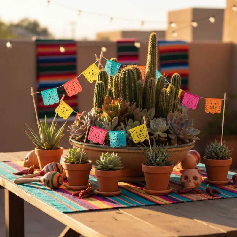Bring the desert indoors with charming cactus and succulent arrangements that capture Mexico's natural landscape. These low-maintenance centerpieces look adorable in painted terra cotta pots decorated with geometric patterns or bright colors. Mix real plants with felt or paper versions for budget-friendly options that still look Instagram-worthy. Create varying heights by using different sized pots or placing them on decorative books. Add mini sombreros, tiny Mexican flags, or colorful pebbles for extra festive touches. Group odd numbers together for visual appeal, or line them down long tables for a modern desert garden effect. The best part? Real succulents double as party favors guests can take home. For evening parties, weave battery-operated fairy lights through the arrangements for a magical glow. These centerpieces work perfectly for both indoor and outdoor celebrations.