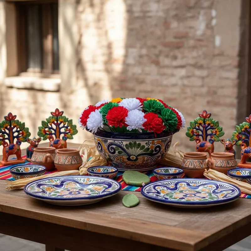 Showcase the beauty of Mexican craftsmanship by incorporating traditional pottery and Talavera-style pieces throughout your decor. Group different sized pottery pieces as centerpieces, filling some with flowers and others with snacks or utensils. Use large pottery bowls for serving dishes that double as decoration. Display decorative plates on stands or create a wall arrangement for visual impact. Mix authentic pieces with affordable replicas to achieve the look within budget. Paint terra cotta pots with traditional patterns for DIY versions that capture the spirit. Use pottery pieces as candle holders, adding warm light that highlights their colors and patterns. These ceramic elements add authenticity and artisanal charm to your celebration while providing functional serving pieces. The handcrafted feel of pottery brings warmth and character that makes your party feel more intimate and special.