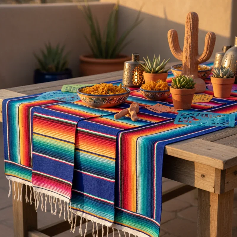 Add instant authenticity to your table settings with vibrant serape runners that showcase traditional Mexican textile patterns. These striped wonders transform plain tables into festive focal points with their rainbow colors and distinctive designs. Layer them over solid tablecloths for depth, or let them shine solo on wooden tables for a rustic look. Can't find authentic serapes? Create the look with striped fabric or even coordinating scarves arranged down the table center. Place white dishes on top to let the colors pop, or go bold with mix-and-match colored plates. Use multiple runners across long tables or drape them diagonally for visual interest. They also work beautifully as backdrop elements when hung on walls or draped over chairs. The versatility of serape patterns means they complement both casual backyard gatherings and more formal dinner parties.