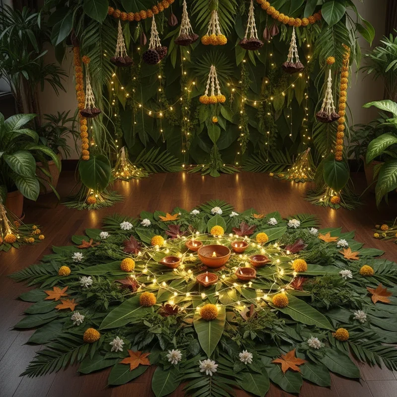 Embrace sustainability with natural leaf decorations that celebrate earth-conscious festivities while maintaining traditional beauty and significance. Collect fallen leaves to create garlands, paint them gold for elegant displays, or arrange them in patterns for natural rangoli alternatives. Banana leaves serve as natural plates and decoration, while mango leaves strung together create traditional thoranam with zero waste. The organic materials decompose naturally after festivities, leaving no environmental footprint while connecting celebrations to nature's cycles. Press leaves between glass for window decorations that filter light into green-tinted rays reminiscent of forest canopies. Use large leaves as stencils for rangoli patterns or backgrounds for diya arrangements that highlight natural textures. This approach teaches children environmental responsibility while maintaining cultural traditions in meaningful ways. The earthy elements ground festivities in natural beauty that commercial decorations cannot replicate.