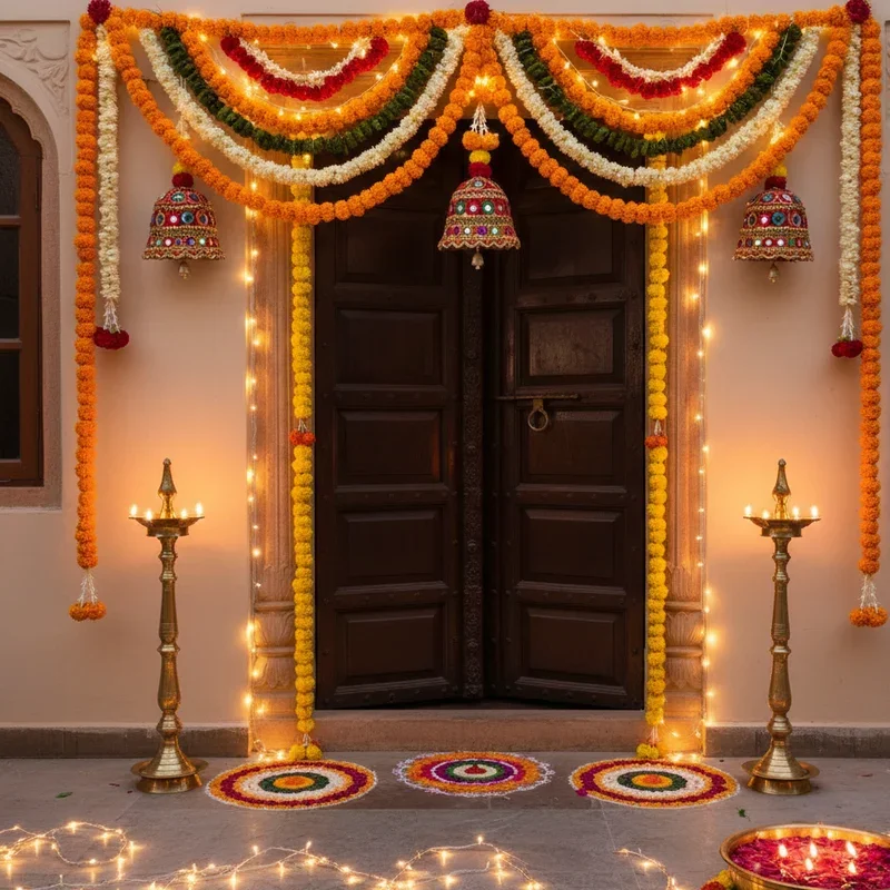 Welcome prosperity with decorative toran that frames doorways in festive splendor while following vastu principles for positive energy flow. Create them using marigold flowers, mango leaves, and colorful beads strung together in patterns that catch breeze and light. Modern versions incorporate mirrors, bells, and LED lights for contemporary twist on traditional designs that appeal to younger generations. The gentle tinkling of bells announces arrivals while mirrors reflect light and symbolically multiply prosperity entering your home. Choose ready-made options in fabrics like silk or velvet embroidered with golden threads for instant elegance without crafting time. Customize lengths to fit different doorway sizes, ensuring proportional decoration that doesn't overwhelm smaller entrances or appear insignificant in grand ones. This symbolic decoration marks the threshold between outside world and festive sanctuary within. Layer multiple torans for extra festivity during the five-day celebration period.