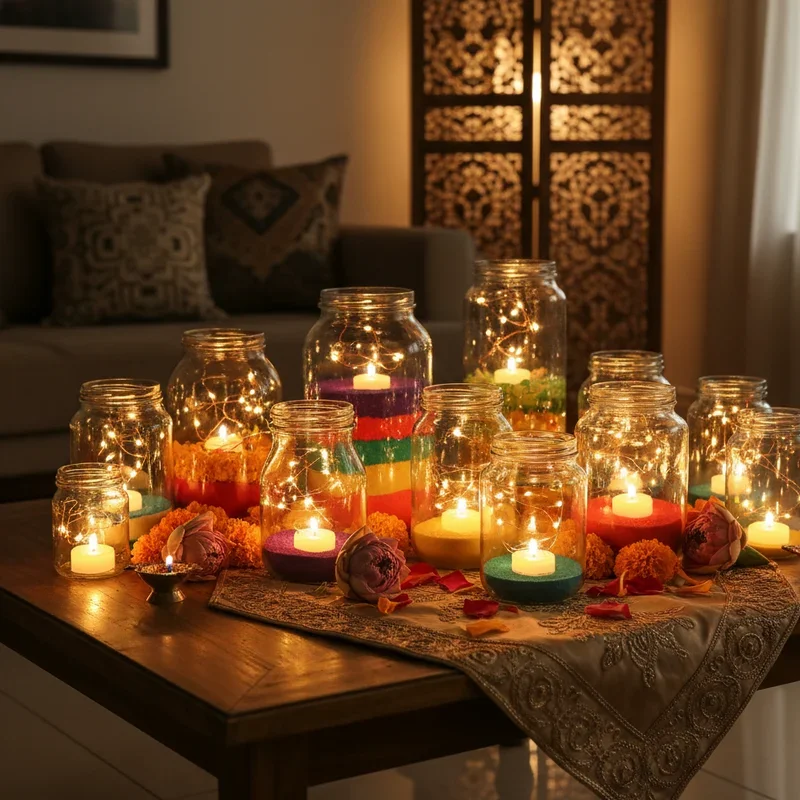 Upcycle glass jars into enchanting luminaries that provide creative lighting solutions while being environmentally conscious and budget-friendly. Paint them with translucent colors, wrap with decorative paper, or etch designs for personalized light diffusers that match your theme. Fill with fairy lights, sand and candles, or colored glass beads that catch and scatter light in interesting patterns. The DIY nature allows complete customization, making each luminary unique while involving family in preparation festivities. Hang them with wire for floating displays, line pathways for guided illumination, or cluster on tables for intimate lighting zones. Add glitter, sequins, or mirror pieces to exteriors for extra sparkle that multiplies light effects dramatically. This sustainable approach reduces waste while creating memorable decorations that become family treasures. The protected flames make them safer than open diyas while maintaining warm, flickering light that defines Diwali.