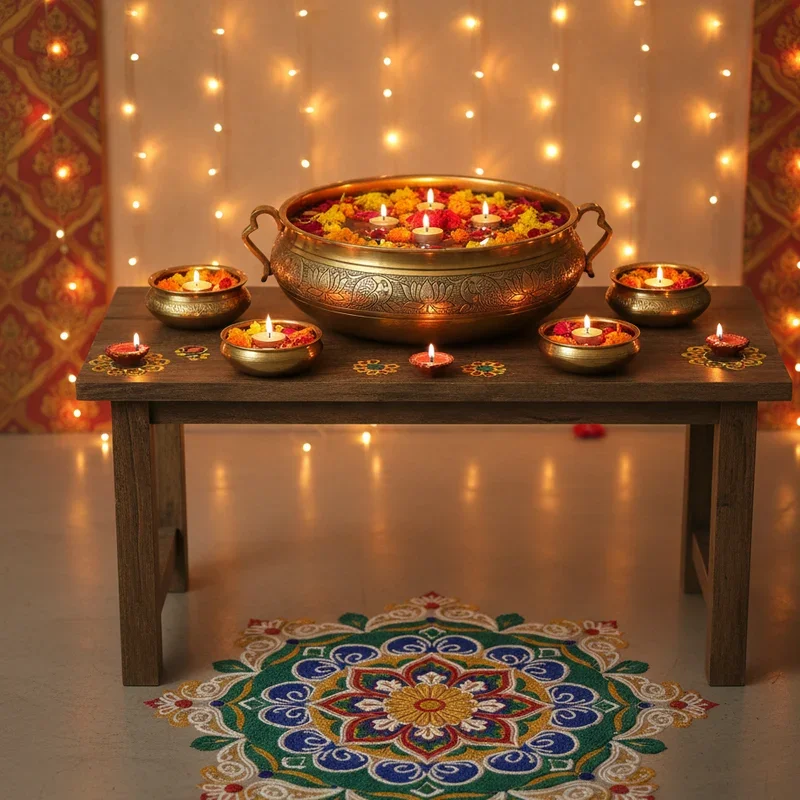 Showcase traditional brass urlis as stunning centerpieces that combine functionality with artistic beauty in your Diwali decor. These wide-mouthed vessels become miniature gardens when filled with water, floating flowers, and diyas that create mesmerizing displays. Polish them to high shine for maximum light reflection, or embrace their patina for antique charm that tells stories. Arrange multiple urlis of different sizes for tiered displays that draw eyes through your space naturally. The circular shape symbolizes completeness and unity, making them auspicious additions to festive decorations. Fill them differently throughout your home: flowers in living areas, fruits in dining spaces, or colored water with floating candles for evening ambiance. Their versatility extends beyond Diwali, making them worthwhile investments that enhance decor year-round. This traditional element grounds modern decorations in cultural authenticity while serving practical purposes.