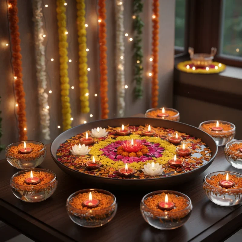 Transform bowls and urlis into mesmerizing water features with floating candles and flowers that create serene focal points throughout your home. Fill brass, copper, or glass vessels with water, then float tea lights among rose petals, marigold heads, and lotus blooms. The reflection doubles the visual impact while water movement creates gentle ripples of light across nearby surfaces. Add food coloring to water for colored effects, or include floating glitter for extra sparkle that catches candlelight beautifully. Position these arrangements on coffee tables, dining centers, or entrance consoles where they command attention without obstructing movement. The combination of elements represents the five cosmic elements, making this decoration both beautiful and symbolically meaningful. Change flowers daily to maintain freshness, or use silk flowers for lasting displays that require minimal maintenance. This calming decoration adds tranquility amidst festive excitement.