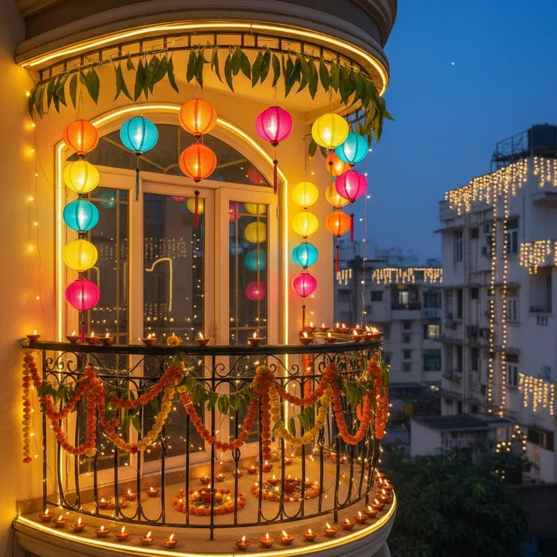 Extend your celebration beyond interior walls with balcony and window lighting that shares festive joy with your neighborhood community. String lights along railings, hang lanterns from ceiling hooks, and place diyas on window sills for layered illumination visible from streets. Create light curtains in windows that transform your home's facade into glowing artwork that spreads celebration beyond personal space. Use weather-resistant decorations that withstand wind and moisture while maintaining beauty throughout the festival period. Coordinate with neighbors for unified building decoration that creates stunning collective displays larger than individual efforts. Include plants decorated with small lights for green elements that soften architectural lines while adding natural beauty. This outward-facing decoration invites community participation and spreads festival spirit to passersby who share in your celebration's glow. The exterior lighting becomes gift to your neighborhood, embodying Diwali's message of spreading light.