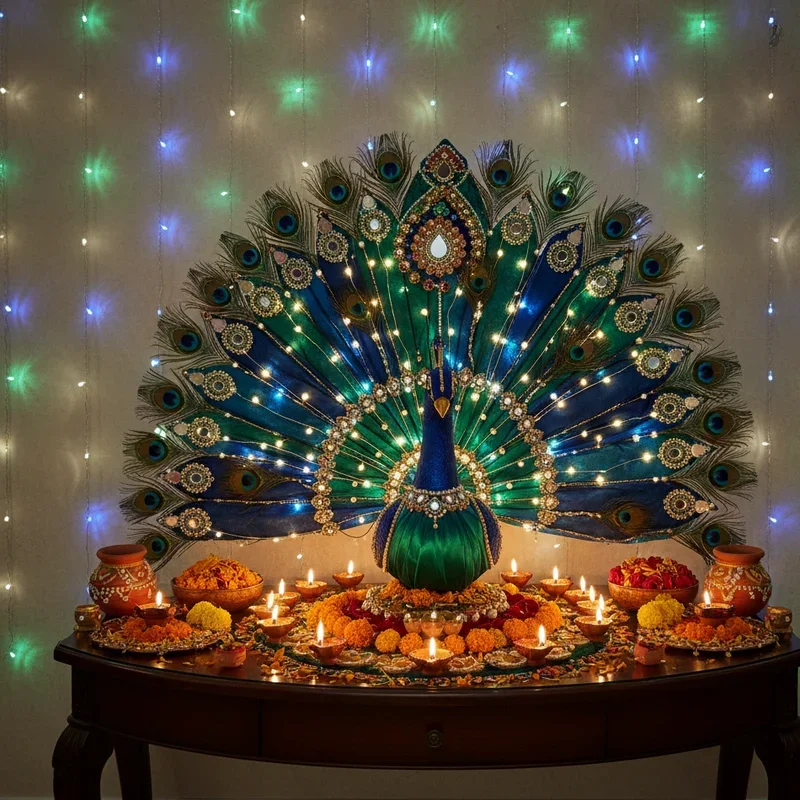 Celebrate India's national bird with peacock-themed decorations that bring color, elegance, and symbolic prosperity to your Diwali setup. Use peacock feathers in flower arrangements, create rangoli featuring peacock motifs, or display brass peacock artifacts as statement pieces. The iridescent blues and greens add jewel tones that complement traditional gold and red decorations beautifully. Paint diyas with peacock designs, hang peacock-shaped lights, or use peacock print fabrics for coordinated theming throughout your space. The bird's association with beauty, grace, and good fortune makes it especially auspicious for Diwali celebrations. Create peacock-shaped diya arrangements or use feathers to frame mirrors and doorways for subtle incorporation of this theme. Modern interpretations include geometric peacock patterns or abstract representations that suit contemporary aesthetics. This versatile theme works in traditional and modern settings alike, bridging generational decoration preferences.