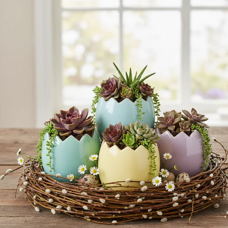 Combine the trendy appeal of succulents with Easter tradition by turning eggs into tiny planters. Carefully crack the tops off real eggs, empty and rinse them, then fill with cactus soil and plant mini succulents or air plants. Paint the shells in soft pastels or leave them natural for an organic look. Display them in an egg carton painted gold or white, or in individual egg cups arranged down the table's center. These living decorations last long after Easter, making them perfect party favors. The juxtaposition of delicate eggshells with hardy succulents creates visual interest while symbolizing new growth and resilience. Add small name tags to use them as place cards that guests can take home. This eco-friendly centerpiece appeals to plant lovers and provides a modern twist on traditional Easter decor that doesn't scream "Easter" too loudly.