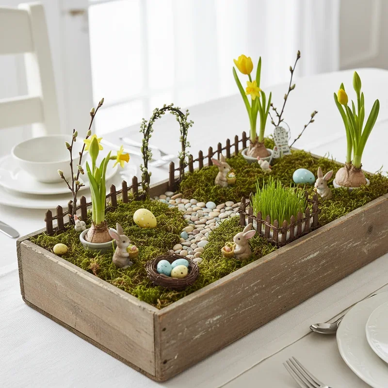 Think of this as your own portable piece of Easter paradise. Find a vintage wooden crate or decorative box and line it with plastic before adding a layer of potting soil. Plant small spring bulbs like grape hyacinths, crocuses, or mini daffodils, leaving room between them for decorative elements. Create little pathways using aquarium gravel or tiny pebbles, and add miniature garden accessories like tiny bunnies, wheelbarrows, or picket fences. A small mirror can become a pond, while moss creates rolling hills. This living centerpiece continues to grow and bloom throughout the Easter season, making it a gift that keeps giving. Position it where everyone can admire the intricate details you've created. After Easter, transfer the bulbs to your outdoor garden where they'll bloom again next year, making this an eco-friendly option.