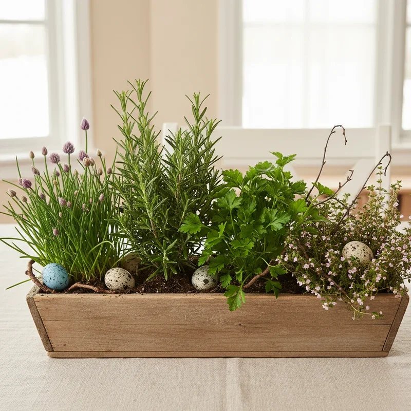 Why not make your centerpiece both beautiful and functional? Plant a variety of herbs in a long wooden planter or individual terra cotta pots arranged on a tray. Choose herbs that are already established for instant impact: basil, rosemary, thyme, and mint create varying heights and textures. Add decorative plant markers and tie small Easter eggs or ribbon bows to stakes nestled among the herbs. The fresh scent enhances the dining experience while the green palette feels fresh and spring-like. Guests can pinch off herbs to add to their meals, making this an interactive element. After Easter, transplant the herbs to your kitchen garden or give them as gifts. This centerpiece appeals to food lovers and gardeners alike, combining practicality with beauty. The living plants symbolize growth and renewal, perfect themes for Easter celebration.