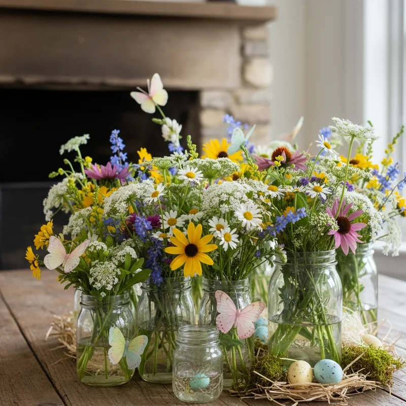 Channel the feeling of a spring meadow with a collection of mason jars filled with wildflowers and adorned with butterflies. Use various sized jars for visual interest, wrapping them with twine, lace, or burlap ribbons. Fill each with different wildflowers: Queen Anne's lace, lavender, baby's breath, and cornflowers create a natural, just-picked look. Attach artificial butterflies to thin wires and position them hovering above the flowers as if they're about to land. Arrange the jars on a wooden board or vintage tray, filling spaces between with moss or scattered flower petals. This centerpiece captures the essence of spring's transformation and works beautifully for outdoor Easter celebrations. The casual, collected-over-time appearance makes it feel authentic and unfussy. Best of all, it's budget-friendly since wildflowers are often free for the picking or very affordable at farmers' markets.
