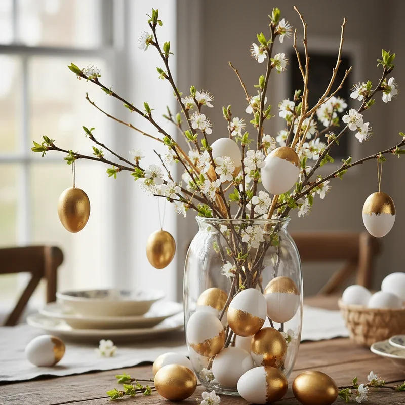 Elevate your Easter table with a touch of glamour by incorporating gold-dipped elements into your centerpiece. Start with white or kraft-colored eggs and dip them partially in gold paint, creating an elegant ombré effect. Arrange bare branches in a tall vase and spray paint the tips gold for cohesion. Hang the gold-dipped eggs from the branches using metallic thread or thin ribbon. Add white flowers like roses or peonies at the base to soften the metallic elements. This sophisticated centerpiece proves Easter decor doesn't have to be all pastels and bunnies. It transitions beautifully from day to evening celebrations and photographs beautifully in any lighting. The combination of natural branches with luxe gold accents creates a balanced look that's both organic and refined. This style works particularly well for adult Easter dinners or when you want your spring decor to feel more upscale.