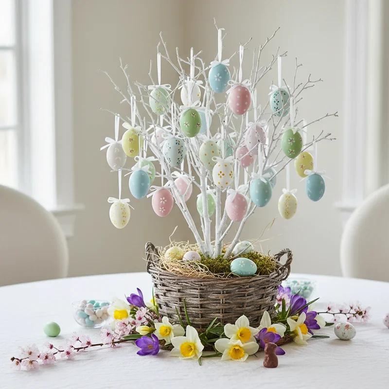 Who says Christmas should have all the fun with decorative trees? An Easter egg tree brings that same festive vertical element to your spring celebration. Start with bare branches from your yard or craft store, spray paint them white or leave them natural for a rustic vibe. Secure them in a weighted vase filled with sand or decorative stones. Now comes the fun part: hanging delicate pastel eggs from thin ribbon or fishing line creates movement and whimsy. You can use blown-out real eggs decorated with paint, hollow plastic eggs filled with confetti, or even purchase ornate ceramic eggs for a more elegant look. Add small silk flowers, butterflies, or tiny bird figurines to the branches for extra charm. This centerpiece works beautifully as a conversation starter and can be customized to match any color scheme you're working with.
