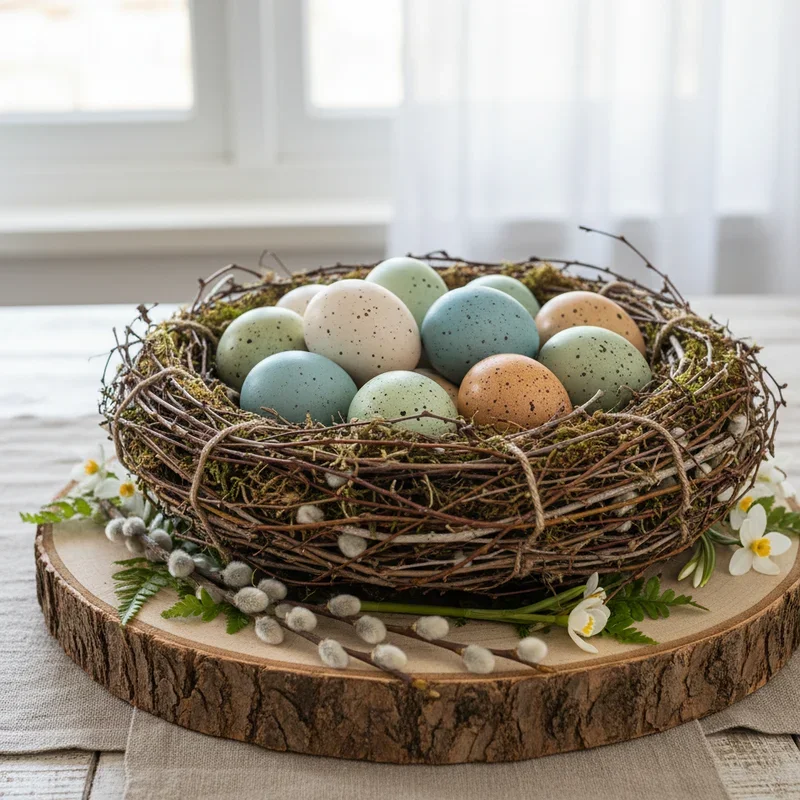 Bring the outdoors in with a centerpiece that looks like it could have been plucked straight from a countryside hedge. Start by gathering several sizes of twig nests from craft stores or make your own using grapevine and Spanish moss. Arrange them on a wooden tray or rustic charger, layering different sizes for depth. Fill each nest with speckled eggs in various sizes; quail eggs add authenticity while larger foam eggs can be painted with brown speckles using a toothbrush technique. Tuck in preserved moss, small ferns, and maybe a few feathers for texture. Add height by placing one nest atop a stack of vintage books or a wooden pedestal. This natural centerpiece captures the essence of new beginnings and works especially well with farmhouse or cottagecore table settings. Your guests will appreciate the organic beauty and attention to detail.