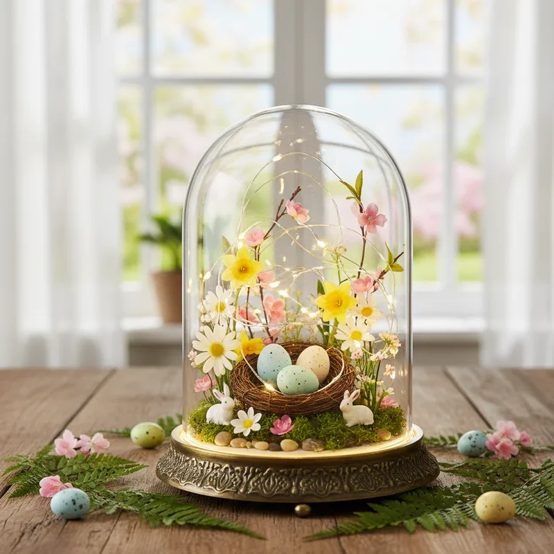 Create a magical miniature world under glass that captures the wonder of Easter morning. Start with a glass cloche or bell jar and create a scene on its wooden or ceramic base. Build a small landscape using preserved moss as grass, tiny flowers as trees, and miniature Easter figurines like bunnies, chicks, or lambs. Add small decorated eggs, a tiny nest, or even a miniature garden bench. The secret to making it extraordinary? Add battery-operated string lights or a small LED spotlight underneath to illuminate your scene from within. The glass dome magnifies and protects your creation while creating an enchanted atmosphere. This centerpiece becomes a focal point that draws people in to examine all the tiny details. It's like having a snow globe for spring, minus the snow. After Easter, simply change out the seasonal elements to create new scenes throughout the year.