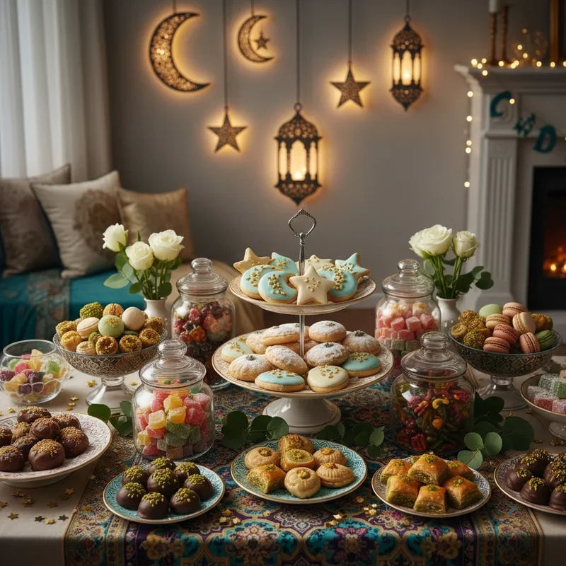 Design elaborate dessert tables that showcase traditional Eid sweets alongside modern treats in visually stunning arrangements. Use tiered stands, cake pedestals, and decorative platters at varying heights for dynamic displays that draw immediate attention. Label each sweet with decorative cards identifying treats and their significance, educating guests while adding decorative elements. Include traditional offerings like baklava, maamoul, and dates alongside contemporary desserts for diverse selection appealing to all tastes. Decorate the table backdrop with banners, balloons, or flowers that frame the sweet display as celebration centerpiece. Glass containers filled with colorful candies add visual interest while providing easy guest access to treats. This edible decoration becomes a gathering point where guests admire presentation while sampling delicious offerings.