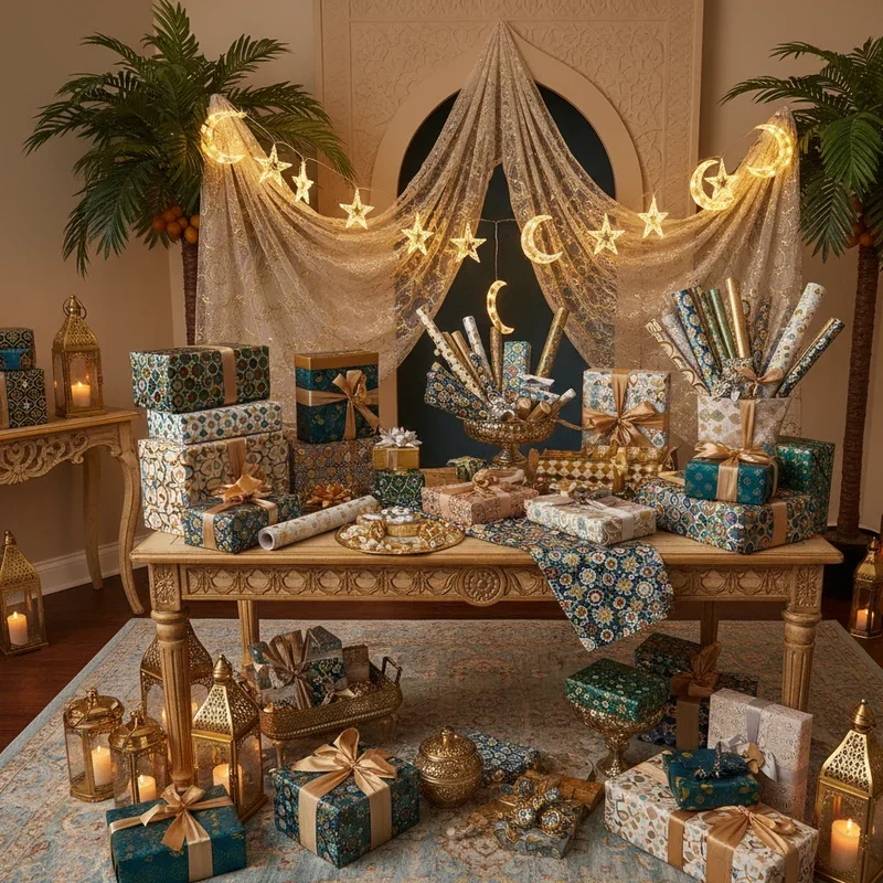 Set up dedicated gift wrapping stations that serve both functional and decorative purposes during Eid's gift-giving traditions. Display rolls of festive wrapping paper in containers that complement your decor, making them part of the visual celebration. Organize ribbons, bows, and decorative elements in clear containers or hanging organizers that add color while remaining accessible. Include gift tags with Eid greetings in multiple languages, honoring diverse guest backgrounds while maintaining Islamic tradition. The visible preparation area builds anticipation for gift exchanges while encouraging family participation in wrapping activities. Position stations in social areas where wrapping becomes communal activity rather than solitary task. This functional decoration evolves throughout celebration as wrapped gifts accumulate, creating excitement for exchange moments.