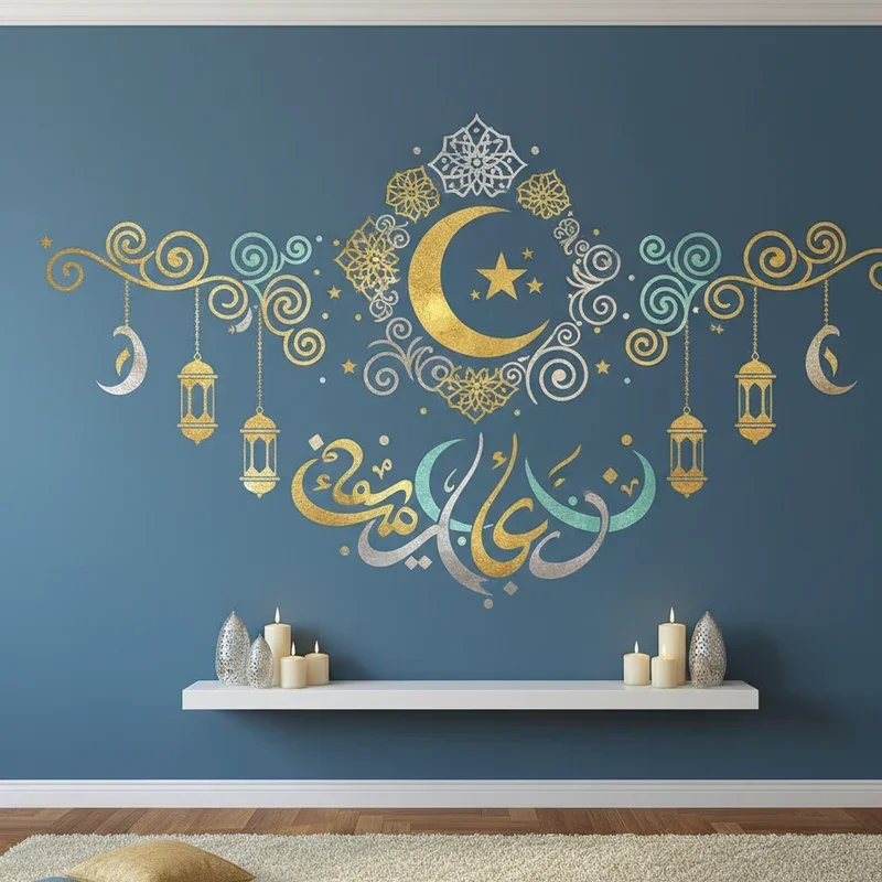 Apply removable wall decals featuring Eid greetings, geometric patterns, and festive designs that transform plain walls into celebration backdrops. Choose decals in metallic finishes that catch light and add glamour without permanent commitment to wall changes. Create feature walls behind buffet tables or in photo areas where decorative impact is maximized for both function and memories. Mix different decal sizes and designs for organic arrangements that feel collected rather than manufactured. The temporary nature makes them perfect for renters or those who prefer changing decorations annually. Position decals at various heights to create visual flow that guides eyes through spaces naturally. These modern decorations offer clean, sophisticated alternatives to traditional hanging decorations while maintaining festive atmosphere.