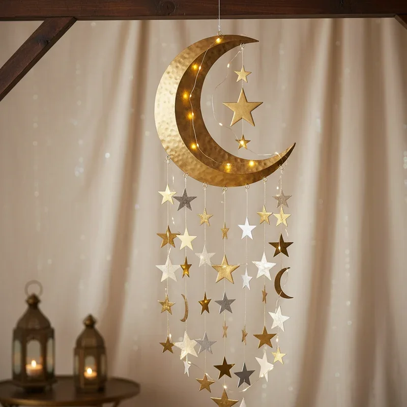 String together crescents and stars in metallic papers to create garlands that sparkle and shine throughout your celebration spaces. Hang these celestial decorations at varying heights, creating layers that add depth and visual interest to any room. Mix different sizes and finishes, combining glittery card stock with mirror paper for maximum light reflection and movement. Drape garlands along staircases, across windows, and around doorframes where they catch both natural and artificial light beautifully. Add LED fairy lights interwoven with garlands for evening celebrations that glow with warm, inviting light. These versatile decorations transition seamlessly from Ramadan through Eid, maximizing your decorating investment while maintaining thematic consistency. The symbolic nature of moons and stars connects your celebration to Islamic tradition while adding festive beauty.