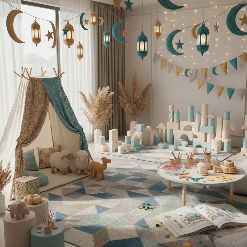 Designate special areas for children with age-appropriate decorations and activities that keep young guests engaged throughout celebrations. Create low tables with Eid-themed coloring pages, craft supplies, and games that entertain while adults socialize. Decorate children's areas with extra balloons, streamers, and cartoon-style Eid characters that appeal to young sensibilities. Include floor cushions and small chairs that accommodate children comfortably while maintaining festive decoration themes. Set up craft stations where children create Eid cards or decorations they can take home as party favors. The dedicated space prevents children from disrupting adult areas while ensuring they feel included in celebrations. Bright, playful decorations in these zones contrast with sophisticated adult spaces while maintaining overall Eid themes.