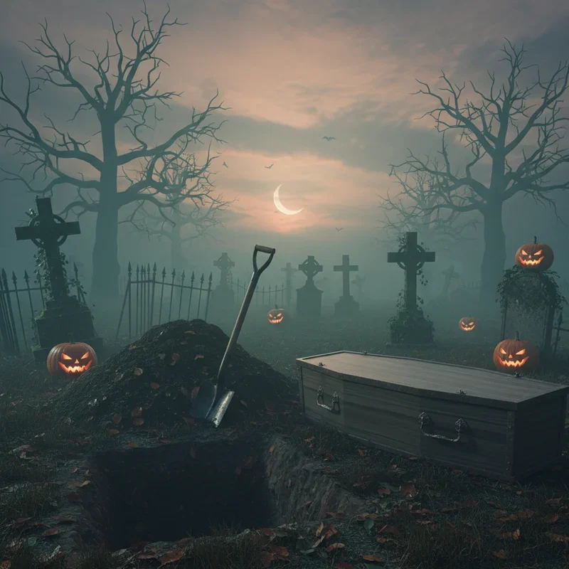 Stage an interrupted burial scene complete with fresh grave, abandoned tools, and mysterious disappearance evidence. Dig a shallow depression lined with black plastic to simulate an open grave. Position a wheelbarrow with shovels, pickaxe, and lantern as if workers fled suddenly. Add muddy footprints leading away from the grave toward your house. Include an empty coffin with lid ajar suggesting occupant escaped or was taken. Scatter work gloves and a lunch pail for realistic detail. Place a mannequin dressed as grave digger slumped nearby or partially buried. Add fresh dirt mounds with wheelbarrow tracks for work-in-progress authenticity. This scene tells a story that makes visitors wonder what caused such hasty abandonment.