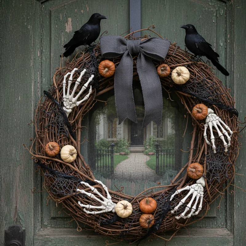 Create a bone-chilling entrance with skeletal hands that appear to grab visitors from beyond the grave. Purchase several plastic skeleton hands from the dollar store and spray paint them in various shades of white, cream, and grey for realistic bone variation. Attach them to a dark wreath base at different angles, making some reach outward while others curl inward menacingly. Weave black roses or dark purple flowers between the fingers for a gothic romance vibe. Add LED tea lights behind translucent fabric strips to create an ethereal glow effect. Position one hand holding a vintage key or pocket watch for storytelling elements that make guests wonder about the skeleton's past life. This interactive wreath practically begs people to lean in closer, only to jump back when they realize how realistic those grasping fingers look.