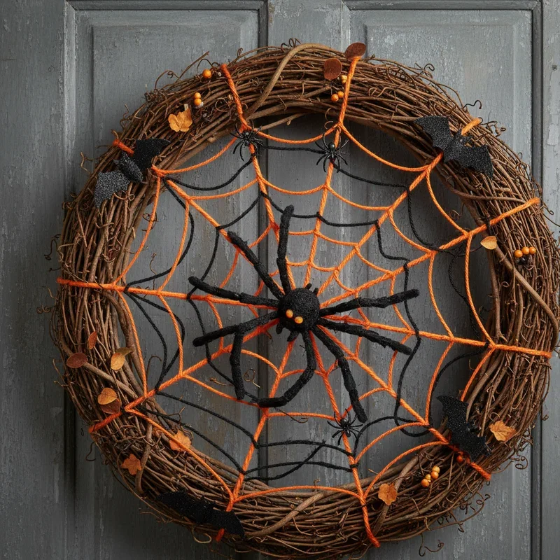 Start your spooky transformation with a timeless spider web wreath that combines traditional Halloween colors with eight-legged terror. Begin with a black grapevine or foam wreath base, then weave white or silver yarn in a web pattern, securing at strategic points with hot glue. Add plastic spiders of various sizes, positioning the largest one as the centerpiece while smaller ones appear to crawl toward the edges. Incorporate orange ribbon bows at the cardinal points for color pops that break up the monochrome web. Dust everything with silver glitter spray for a dewy morning effect that catches porch light beautifully. This design works because it's instantly recognizable as Halloween while maintaining elegance that doesn't look cheap or hastily thrown together, perfect for those who want spooky without sacrificing style.