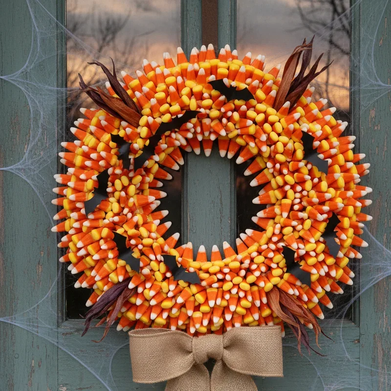 Embrace Halloween's signature candy with a wreath that looks like a candy corn factory exploded on your door. Create candy corn shapes from felt or foam in traditional white, orange, and yellow, varying sizes from tiny to jumbo. Arrange them in a gradient pattern or mix randomly for chaotic sweetness. Add real wrapped candy corn packages for three-dimensional interest and potential trick-or-treater bribes. Incorporate orange and yellow ribbons woven throughout, with some trailing down like melting candy. Include other candy elements like lollipop decorations or gummy worm accents for variety. Use a hot glue gun to attach everything securely, ensuring nothing falls when the door opens and closes. This cheerful design perfect for families wanting festive rather than frightening decorations that celebrate Halloween's sweeter side while maintaining visual impact.