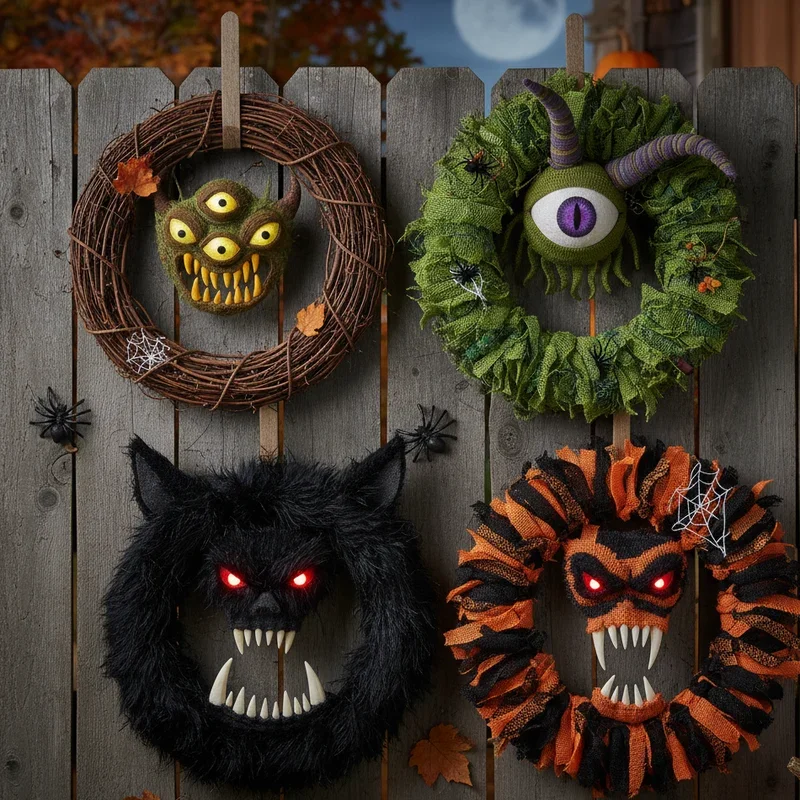 Transform your entrance into monster headquarters with wreaths designed as different creature faces. Create Frankenstein using green felt or painted burlap for skin, with bolts made from painted toilet paper rolls and yarn for stitches. Design a vampire with pale fabric, red felt lips revealing foam fangs, and a dramatic black cape collar. Build a werewolf using faux fur in browns and grays with plastic teeth and yellow LED eyes. Each monster wreath should maintain the circular shape while incorporating facial features that break boundaries. Use the wreath opening as a mouth for some designs, creating interactive elements where brave visitors can reach through. Layer textures and materials for depth, making faces appear three-dimensional rather than flat. This collection approach lets you change monsters throughout October or display multiple creatures for maximum impact.