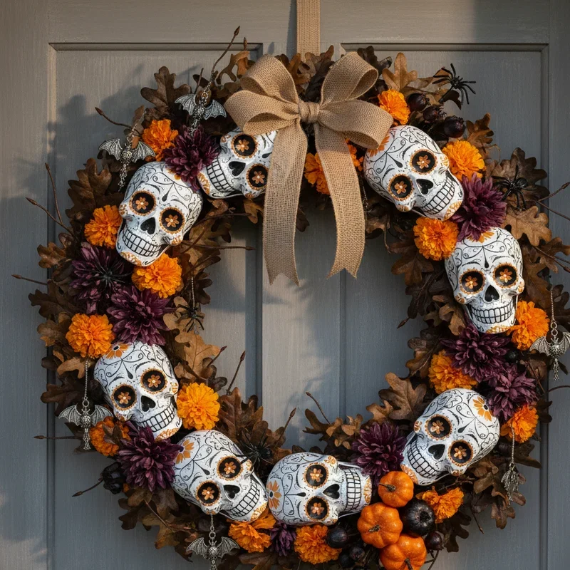 Celebrate Día de los Muertos with a vibrant skull wreath that honors tradition while embracing Halloween timing. Paint foam or plastic skulls in bright colors with traditional Mexican folk art patterns including flowers, hearts, and geometric designs. Arrange skulls facing different directions around a colorful base wrapped in serape fabric or bright ribbons. Add paper marigolds, the traditional Day of the Dead flower, in orange and yellow clusters. Incorporate papel picado (decorative paper cutouts) woven through the design for authentic touches. Include small mirrors on some skulls representing self-reflection and remembrance. Add battery-operated candles for commemorative lighting without fire hazards. Write names of loved ones on small tags attached to skulls for personal memorial elements. This culturally respectful design brings beautiful alternative Halloween decorating that celebrates rather than scares, perfect for inclusive neighborhood displays.