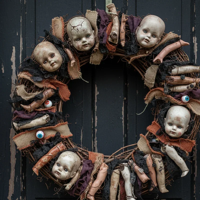 Venture into horror movie territory with a disturbing wreath made from vintage doll parts that'll haunt visitors' dreams. Collect old doll heads, arms, and legs from thrift stores, removing bodies for just the appendages. Paint some parts with crackling medium for aged effects, while leaving others in their original unsettling glory. Arrange heads facing different directions with some eyes open, others closed, creating an unnerving surveillance effect. Weave doll arms through the wreath reaching outward as if trying to escape their circular prison. Add vintage lace, old buttons, and tarnished baby spoons for nursery-gone-wrong aesthetics. Include a music box mechanism that plays a creepy lullaby when triggered by motion sensors. This genuinely scary wreath isn't for the faint-hearted but delivers maximum horror impact for those wanting to truly terrify visitors with psychological scares.