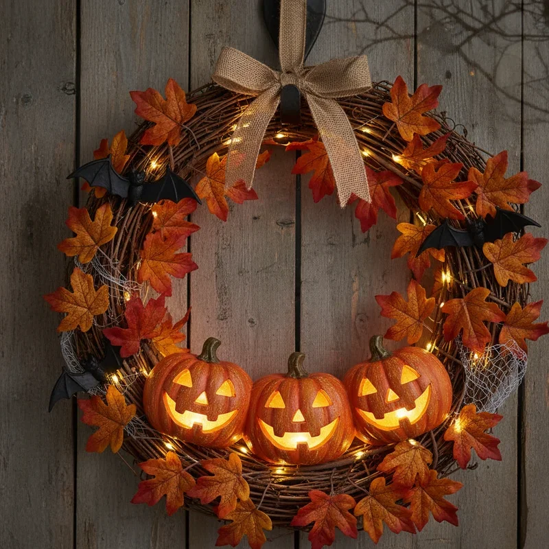 Bring jack-o'-lantern magic to your wreath with miniature pumpkins that actually glow from within. Use foam craft pumpkins in various sizes, carving traditional and unique faces with craft knives. Install battery-operated LED tea lights inside each pumpkin, choosing orange, purple, or color-changing options for variety. Arrange pumpkins around a sturdy wreath base, leaving space between for autumn leaves and twigs. Add metallic paint accents to some pumpkins for glamorous touches that catch light differently. Incorporate timer functions on lights so your wreath automatically illuminates at dusk without daily intervention. Use fishing line to create the illusion some pumpkins float independently from the main wreath structure. This design combines traditional jack-o'-lantern appeal with modern convenience, creating a welcoming glow that guides trick-or-treaters to your door while maintaining spooky season authenticity.