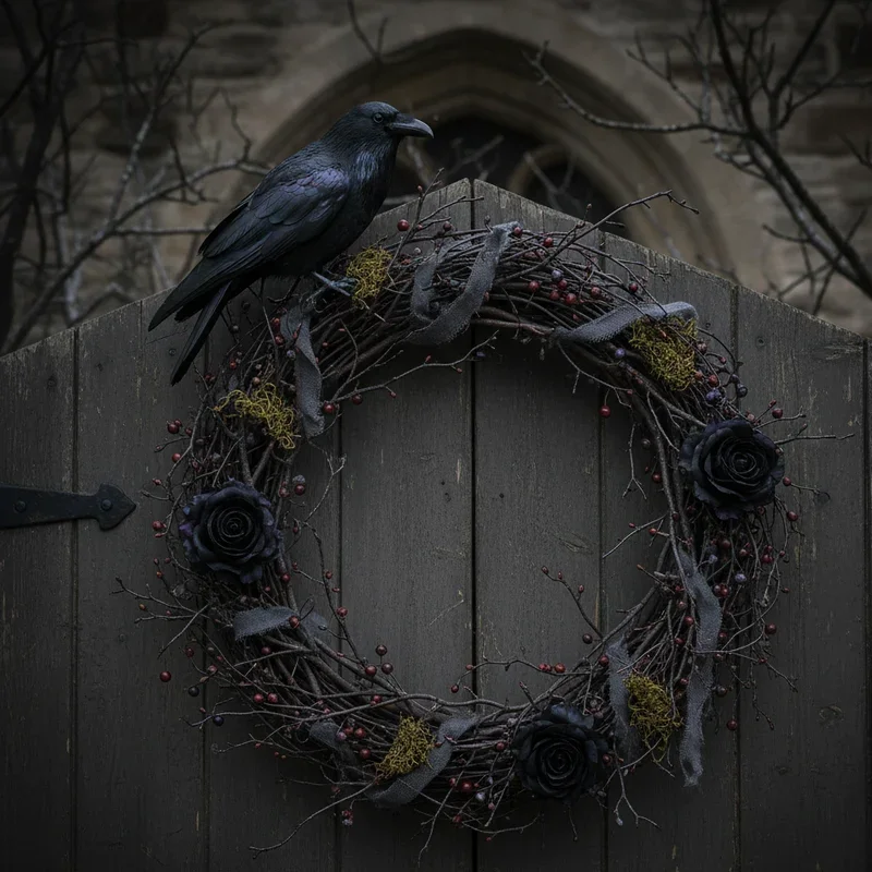 Channel Edgar Allan Poe with a dramatically gothic wreath featuring ravens perched among barren branches. Collect real branches from your yard or purchase artificial ones, spray painting them matte black for uniform darkness. Arrange them in a circular pattern, allowing some to extend beyond the traditional wreath boundary for wild, untamed aesthetics. Position artificial ravens at various heights and angles, with one prominent bird serving as the focal point. Add deep purple or burgundy silk flowers sparingly for color without overwhelming the dark theme. Incorporate vintage keys, old clock parts, or tarnished chains for steampunk gothic elements. String battery-operated micro lights through the branches for subtle illumination that highlights the birds' silhouettes. This sophisticated design appeals to those preferring atmospheric horror over cartoonish Halloween decorations.