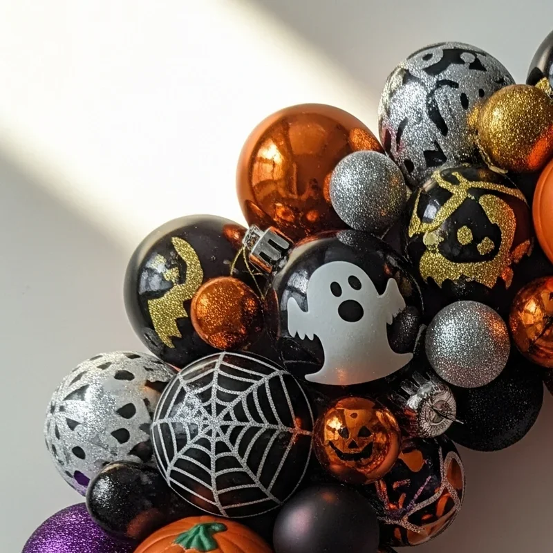 Reimagine Christmas ornament wreaths with Halloween-themed balls creating a glamorous yet spooky entrance decoration. Collect plastic ornaments in black, orange, purple, and metallic finishes, choosing various sizes and textures. Include specialty ornaments shaped like skulls, witches, or pumpkins among traditional spheres. Hot glue ornaments to a foam wreath form, layering larger balls first then filling gaps with smaller ones. Add glittered balls for sparkle and matte black ones for depth contrast. Incorporate miniature Halloween figurines nestled between ornaments for surprise discoveries. Weave battery-operated orange or purple lights through the arrangement for evening glow. Top with a large decorative bow in Halloween patterns or metallic finish. This elegant approach elevates Halloween decorating to match the sophistication often reserved for winter holidays, proving October celebrations deserve equal glamour.