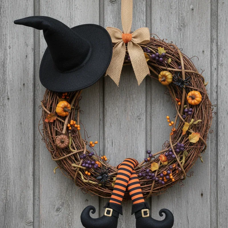 Bring whimsical witchcraft to your door with a wreath featuring a witch who's apparently crashed into your entrance. Create or purchase a classic pointed witch hat and attach it to the top of your wreath, tilting it at a jaunty angle. Add striped witch legs with ruby slippers or buckled boots dangling from the bottom, suggesting she's stuck halfway through your door. Fill the wreath center with purple and green tulle, artificial moss, and miniature spell books or potion bottles. Incorporate battery-operated string lights in purple or green for magical ambiance. Add a small sign reading "Parking for Broomsticks Only" or "Witch Better Have My Candy" for humorous touches. This playful design appeals to both kids and adults, offering just enough spook without being genuinely scary.
